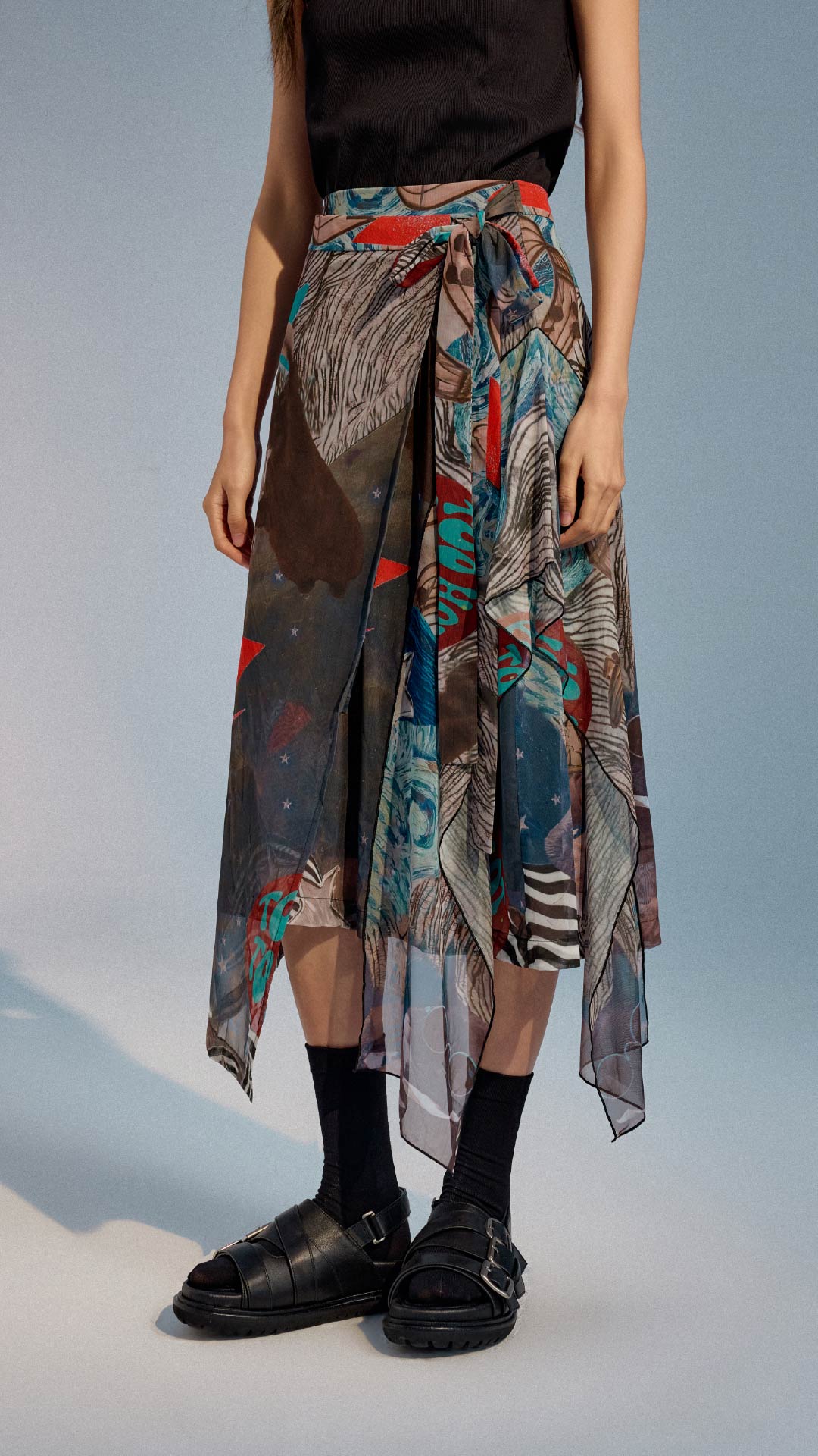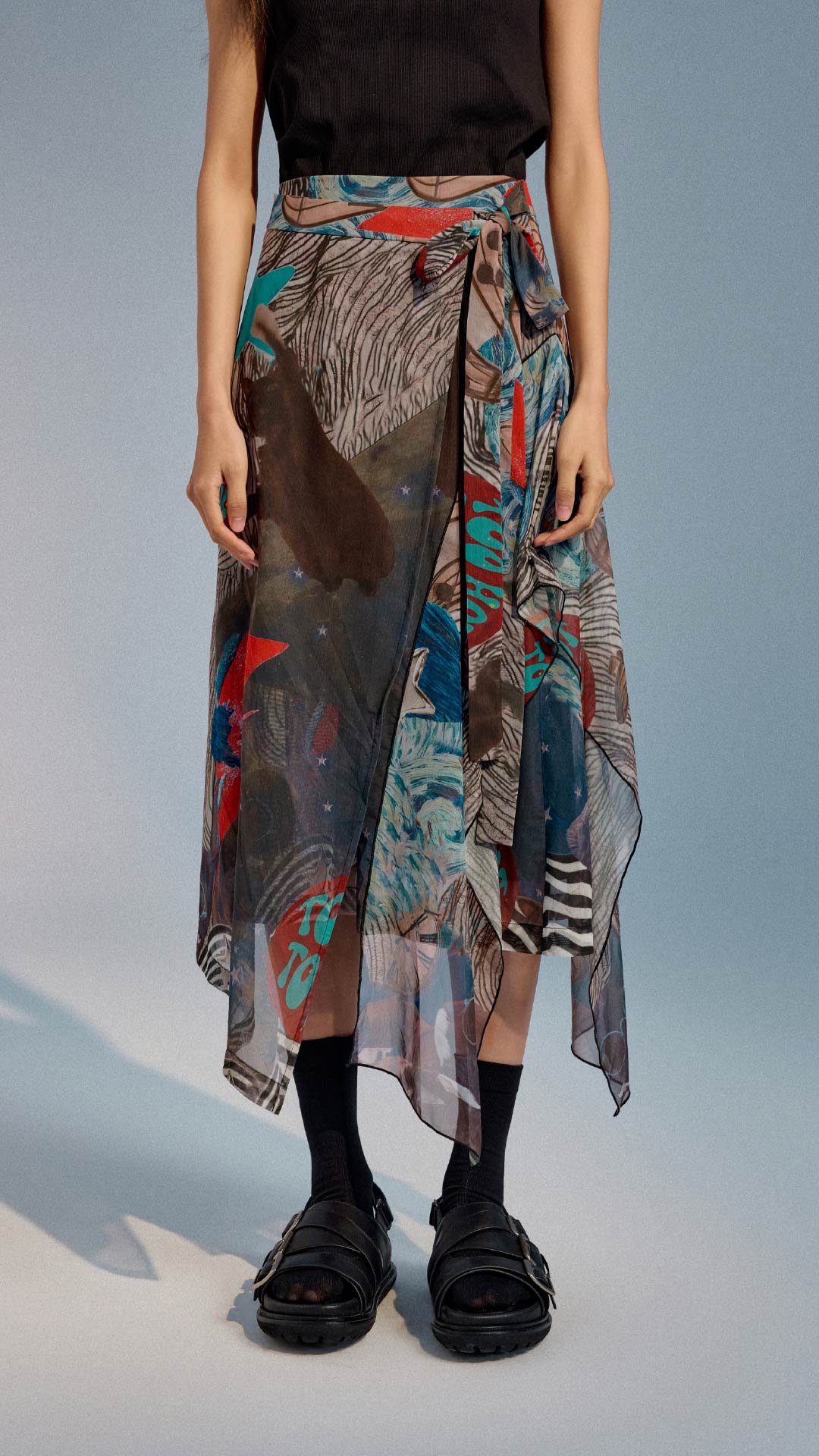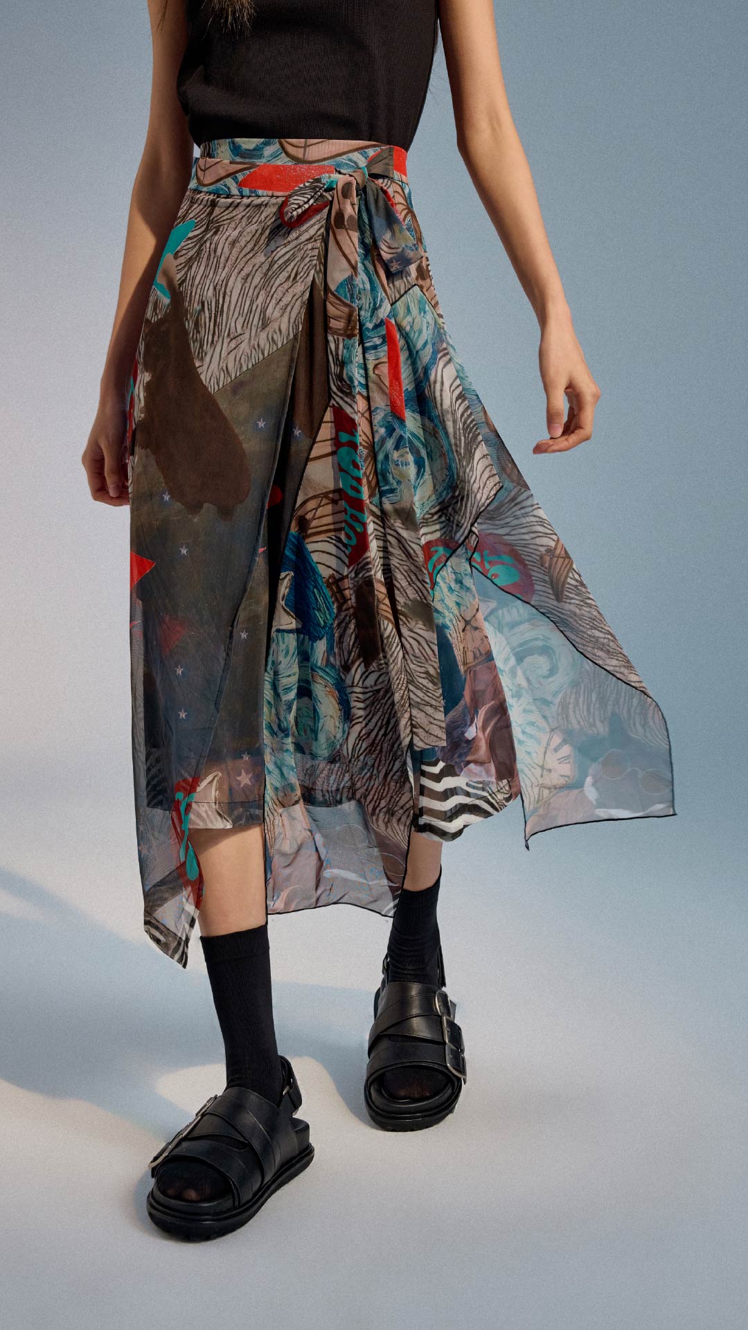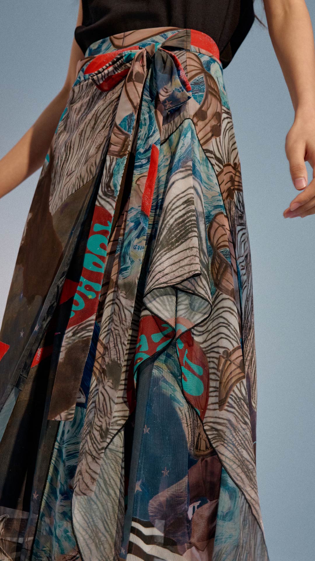 Collage Graphic Mesh Wrap Skirt