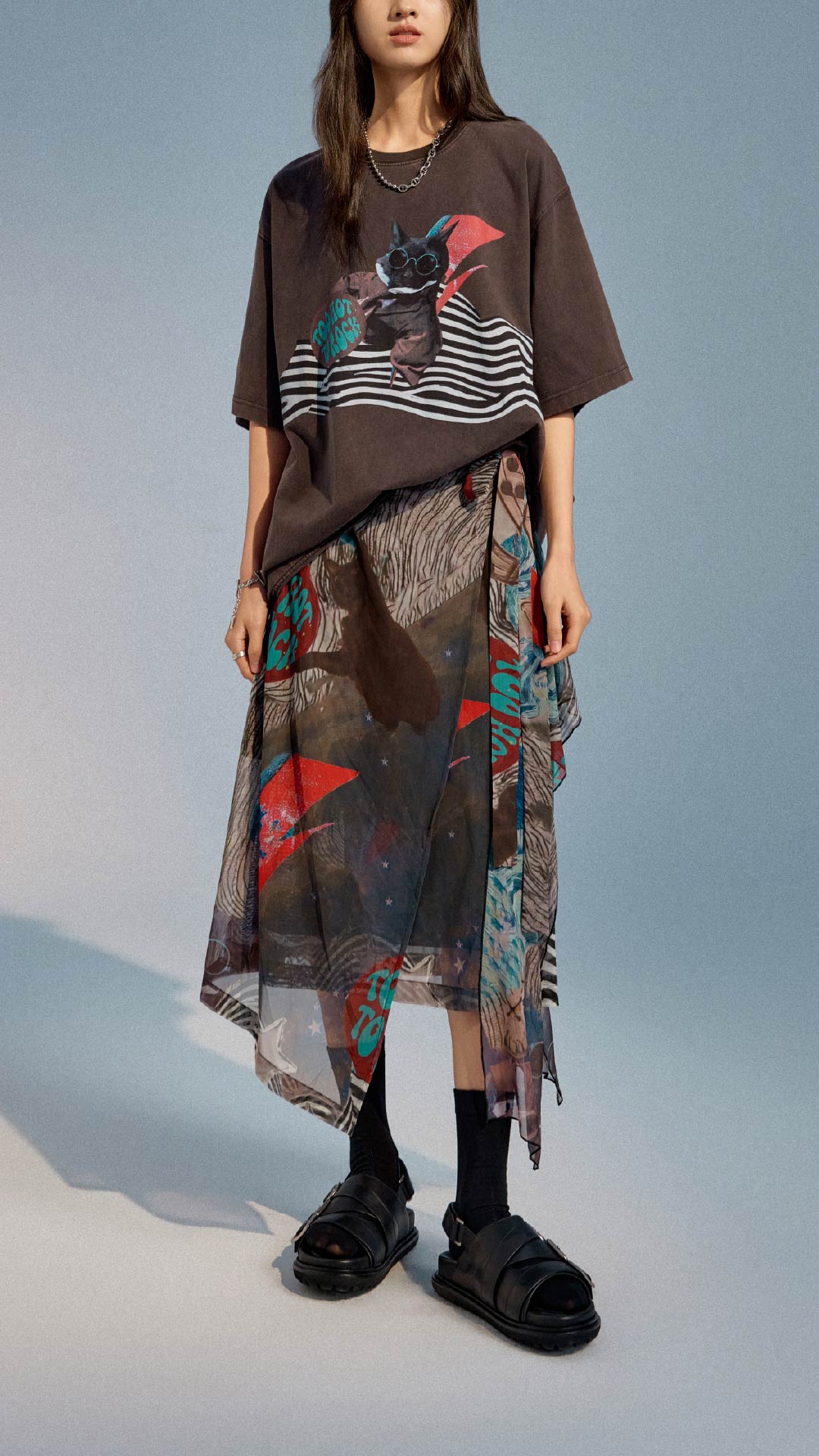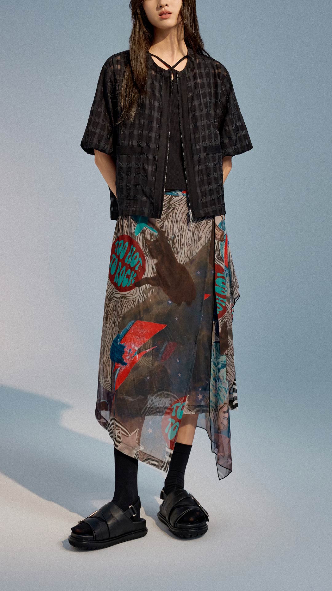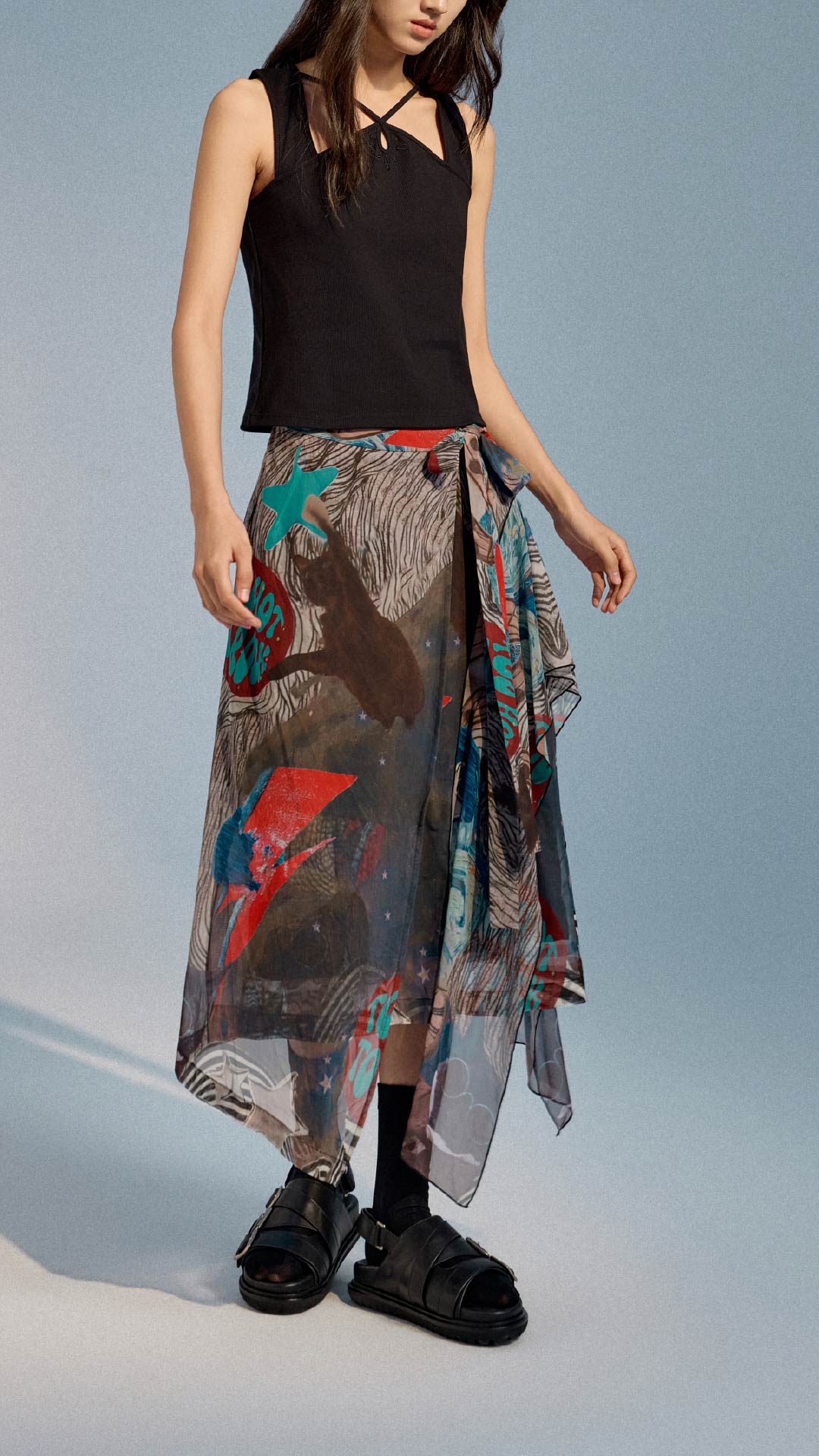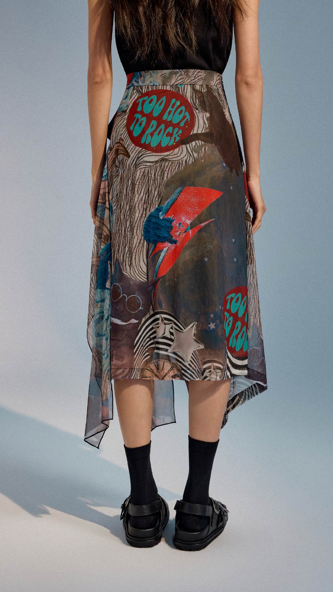Collage Graphic Mesh Wrap Skirt