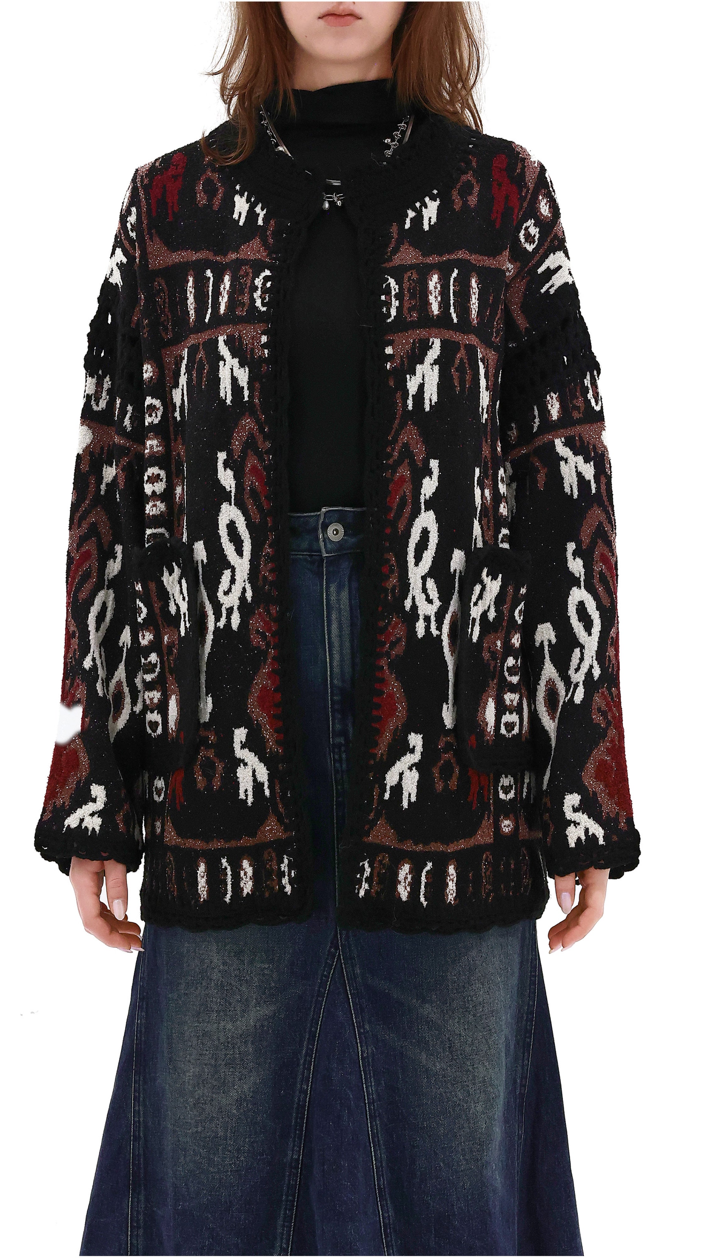 - Crochet-knit round neck, hem, armscyes, pockets and cuffs